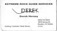 - 1 2 3 4 5 6 Whitehouse, Annie (1999). "An Interview with Derek Hersey". In Long, John; Sponholz, Hai-Van K (eds.). The High Lonesome: Epic Solo Climbing Stories. Helena, MT: Falcon Publishing. pp. 73–85. ISBN 1-56044-858-X.