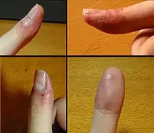 The fingers of a person with dermatophagia. After some time, the repeated biting leaves the skin discolored and bloody.
