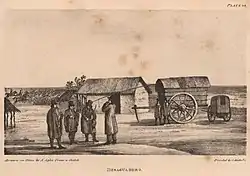 Desaguadero was one of the posts on the Camino Real del Oeste and through it passed the travelers from Buenos Aires heading to San Luis, Mendoza and Santiago de Chile. Peter Schmidtmeyer was one of the travelers who visited the town in the first half of the 19th century. In his book Viaje a Chile a través de los Andes (Journey to Chile through the Andes), published in London in 1824, he refers to his passage through it: “We crossed the desert, which is an ascending terrain with an extension of about fifty miles, without any water except a faint spring, sometimes dry, halfway, and after descending the gentle western slope of this place, we arrived at the post house of Desaguadero: a miserable dwelling, where a wooden grill with a piece of roasted meat and a picturesque resource of the peons made up for the lack of dishes. Near the ranches the river passes with a little water that for the most part is covered with reeds and inhabited by wild ducks, geese and swans ... ” Based on a sketch made on the spot, the Italian painter Agostino Aglio made a lithograph that illustrates this place, in which, in addition to the travelers who arrived at the post, one can see “the troop of horses that are led to the corral, where some will be chosen to cover the next stage; everyone is brought in so that they do not lose the habit of walking together ”, as he explains.[2][3]