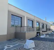 The original part of the building is a reinforced concrete structure on a rectangular base, measuring 50 feet along Desmet and 142 feet deep into the block, that rises four stories above a full basement. Interior structures such as columns, floors and stairways were made of reinforced concrete, as was the exterior. At the time, the new technology behind reinforced concrete was something to celebrate, so the exterior was not covered with a façade and the concrete was left exposed. An article published during the building's construction in The Spokesman-Review, Spokane's daily newspaper, echoed that sentiment, stating, "The concrete piers, the main structural members of the facade, will be rubbed smooth, but will be left in the natural concrete color and indicate frankly the strength and durability of the construction within."[10] The building's main entrance faced Desmet Ave. on the south face of the building, with a centrally located pair of wooden doors that have subsequently been replaced. On either side of the entryway are a pair of matching, large, rectangular metal sash windows. The three stories above feature matching windows, three per floor, separated by concrete piers. Between the first and second story is a simple concrete cornice. A concrete parapet runs along the roofline on the southern face.[10] The east and west faces were initially plain and windowless, but the east face had windows matching those on the front and back sides of the building added during the adaptive reuse redevelopment.[10]