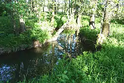In the higher and middle parts of the stream it has almost entirely lost its forest cover: upstream — because of the extraction of phosphorites, in the middle part — because of the plowing.