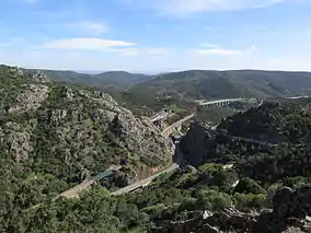 Despeñaperros (literally, [cliff where] dogs plunge) is a gorge or canyon carved out by the Despeñaperros river. It is located in the municipality of Santa Elena in the northern portion of the province of Jaén, Spain. The 76.49-square-kilometre (29.53 sq mi) area was declared a natural park by the Andalusian Autonomous Government, primarily for its geology and landscape, but also for its notable flora and fauna.