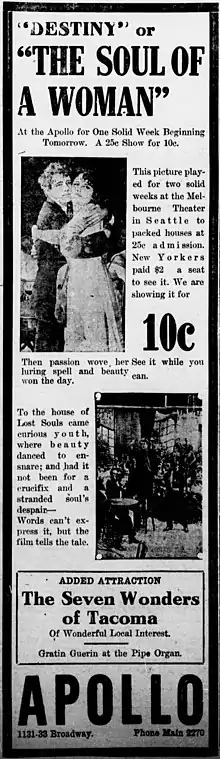 Destiny is a 1915 American silent drama film directed by Edwin Carewe and starring Emily Stevens, George Le Guere and Walter Hitchcock.[1][2]