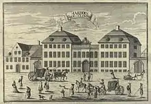 Christina Harboe died in 1735, shortly after her return from a journey to Paris and London. Before her departure, she had written a will which turned her property in Stormgade into a residence for 12 pious widows in need from the upper classes.[1] Thurah's expansion. Illustration from Erik Pontoppidan's Danish Atlas ]] The building was extended with two bays and an extra floor by Elias David Häusser in connection with its conversion into a foundation.