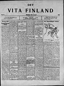 Det Vita Finland was a political newspaper published by the Whites during the Finnish Civil War. It served as the Swedish- language parallel to the Valkoinen Suomi newspaper and was published in the city of Vaasa in Pohjanmaa.[1] The Newspaper was to be published every day at 8 am, except Monday. The editors of the newspaper were Richard Malmberg, Johannes Näse and A. J. Dahl.[2]