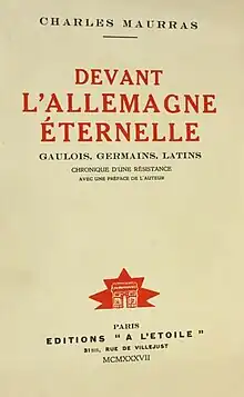 Devant l'Allemagne éternelle (In front of eternal Germany) is a book by the French journalist and politician Charles Maurras, director of L'Action française published in 1937. The work was composed during the author's period of detention in La Santé prison from October 20, 1936, to July 6, 1937, for death threats against Léon Blum. He compiles "texts written for forty years on Germany, pan-Germanism and German influence in France".[1]