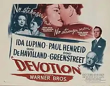 Devotion is a 1946 American biographical film directed by Curtis Bernhardt and starring Ida Lupino, Paul Henreid, Olivia de Havilland, and Sydney Greenstreet. Based on a story by Theodore Reeves, the film is a highly fictionalized account of the lives of the Brontë sisters. The movie features Montagu Love's last role; he died almost three years before the film's delayed release.