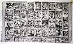 Esszettel that have survived to the present day are usually remains of mass-produced stock which were sold on pilgrimage markets. These types of Esszettel were printed on stamp-like sheets of paper. They were either labeled identically or varied in a certain pattern. The latter version was called Lukaszettel, and one of the printing plates used to print Lukaszettel has been preserved. Sometimes, Esszettel were printed on both sides, the back page complementing the front page. These are considered to be the oldest types of Esszettel.