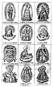 Schluckbildchen had a square, rectangular or round shape and a feed size of 5 to 20 mm. So they were the smallest form of devotional art design. Small pictures of the 19th century were partly bigger, like the version that was produced in Einsiedeln (32x22 mm). Also Schluckbildchen were produced on light sheets of paper; one sheet could hold 130 pieces. Both possible were series of one theme as well as different themes which would always have the same style. Schluckbildchen can be detected after the middle age.[3] Up to the 19th century copper engraving printings were most likely, including some notes (for example in Mariazell) which were produced with a woodcarving technique. Later, colour printing was used; in the 20th century also photomechanical reproduction of old artworks.