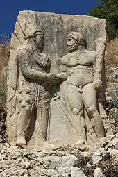 The dexiosis reliefs from Commagene are well known in which the then ruler is shown shaking hands with gods. Dexiosis reliefs are also known from Roman gravestones, which show the deceased with their spouses.[2] Similarly, dexiosis reliefs are found on ancient coins and are they are intended to show bonds between two cities by shaking hands.