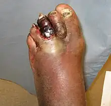 Diabetic foot infection is any infection of the foot in a diabetic person.[3] The most frequent cause of hospitalization for diabetic patients is due to foot infections.[4] Symptoms may include pus from a wound, redness, swelling, pain, warmth, tachycardia, or tachypnea.[5] Complications can include infection of the bone, tissue death, amputation, or sepsis.[3] They are common and occur equally frequently in males and females. Older people are more commonly affected.