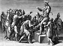 On 5 June 1575, the year of her first dated print, Scultori received the Papal Privilege to make and market her own work.[5] Applying for a papal privilege was a fairly unusual practice before the papacy of Gregory XIII, especially for women, and it allowed her to establish a name for her household. Resembling a book-printing privilege, it is about 300 words in length and names Diana as "wife of Franciscus Cipriani the architect, who is staying in this our alma Urbe ..." and indicates that she learned her art from her father. The privilege suggests that Diana applied for it because she was reluctant to print her engravings without a license and it was to protect her engravings from being copied and then sold "by others of either sex, but most especially book dealers, sculptors, engravers and printers". The privilege rendered any unlicensed publisher or vendor of her engravings liable to a heavy fine of approximately 500 ducati. Of this, one third would have gone to the Pope in office, one third to Diana, and the final third to the judge who issued the decision, naturally encouraging a judgment in favor of the artist. In addition to such a fine, immediate excommunication from the Catholic Church would be incurred.[4][7]