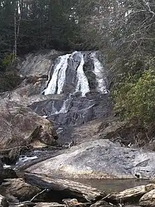 Dick's Creek Falls is a waterfall that features a 60 ft (18 m) drop of Dicks Creek into the Chattooga River. Located in the Chattahoochee National Forest, it is reached by using the Dick's Creek Trail, which is short trail (about 1.4 miles in and out) that connects to the Bartram Trail in eastern Rabun County, Georgia.
