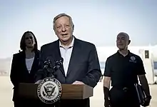 Durbin speaks at a press conference in El Paso, TX with U.S. Homeland Security Secretary Alejandro Mayorkas, along with Vice President Kamala Harris and Representative Veronica Escobar.