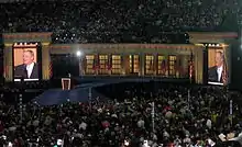 Durbin speaks during the final night of the 2008 Democratic National Convention in Denver, Colorado, introducing his party's nominee, fellow Illinoisan Barack Obama