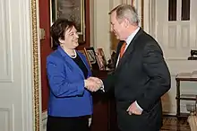 When Majority Leader Harry Reid faced a difficult reelection fight in 2010, some pundits predicted a possibly heated fight to succeed him between Durbin and Senator Chuck Schumer, who is well known for his fund-raising prowess.[22] Reid's reelection rendered such speculation moot. In 2021, Durbin became Senate Majority Whip again for the 117th Congress, as well as becoming chair of the Senate Judiciary Committee. This is the first time that the whip of either party has served as chair of this committee.