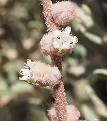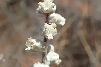 Dicrastylis costelloi is a shrub, growing to about 40 cm high on red sands. Its stems are roughly circular in cross section with no peltate scales. The opposite and entire leaves are 8-25 mm long by 3.2-6 mm wide, and have branched (dendritic) hairs. There are bracteoles (1-2 mm long), and bracts (5-9 mm long. The flowers are sessile. The calyx has five lobes (1.5 mm long), covered in dendritic hairs, and the white or cream corolla is 4.5-5 mm long, with no dots or stripes in its throat. There are five stamens. In Western Australia it flowers in October.[5]