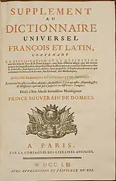 The Dictionnaire de Trévoux, also titled Dictionnaire universel françois et latin, is a French dictionary that appeared in several editions from 1704 to 1771. It was unofficially and then officially nicknamed Dictionnaire de Trévoux because of its original publication in the town of Trévoux (near Lyon, France)[1] Throughout the 18th century, it was widely assumed to be directed by the Jesuits, a supposition supported by at least some modern scholars.[2]