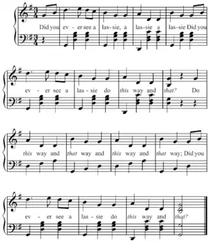 The song is often accompanied by a circle singing game. Players form a circle and dance around one player. When they reach the end of the verse they stop, the single in the middle performs an action (such as Highland dancing), which everyone then imitates, before starting the verse again, often changing the single player to a boy, or a boy can join the center player - thus creating an extra verse in the song ("Did you ever see a laddie...").[5]