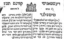 The Dinstagishe un Fraytagishe Kuranten was the earliest known Yiddish-language periodical, founded by Uri Phoebus Halevi (also known as Uri Fayvesh ben Aharon ha-Levi).[1][2] It was a semi-weekly founded in Amsterdam in 1686, that was published on Tuesdays (Dinstag) and Fridays (Fraytag) and it lasted for little over one year.[3] It covered local news and news from other Jewish communities, including those as far away as India.[4][5] Issues of the paper were discovered in 1902 by the librarian David Montezinos.