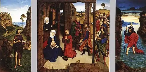 The Pearl of Brabant; left, St. John the Baptist, center, Adoration of the Magi, right; St. Christopher