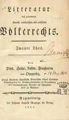 - Dietrich Heinrich Ludwig von Ompteda: Literatur des ges. sowohl natürlichen als positiven Völkerrechts. Regensburg 1785 (dem kursächsischen Comtialgesandten Carl Anton Friedrich Graf von Hohenthal gewidmet)