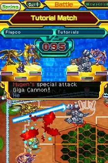 One Digimon attacks another, with the teams of both sides visible on the top screen.