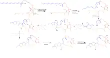 The backbone of HSAF is formed through a hybrid PKS-NRPS cluster containing one nonribosomal peptide synthase (NRPS) module and one polyketide synthase (PKS) module.[2][6][7][8] The single PKS module functions in a non-canonical fashion in that it is an iterative type I PKS responsible for the generation of the two unique polyketides needed in the backbone of HSAF using malonyl-CoA as both the starter and extender unit, while the NRPS module is responsible for the linking of the polyketides to an L-ornithine unit and the initial cyclization to create the tetramate back bone.[2][7][8] The coding region related to HSAF production contains a PKS-NRPS with a total of 9 domains, (KS-AT-DH-KR-ACP-C-A-PCP-TE), while a cascade of FAD-dependent redox reactions (OX1-OX4) flank the PKS-NRPS cluster proposed to be responsible for formation of the 5,5,6-tricyclic system, there are additional coding regions for a putative regulator, an arginase for L-ornithine production from Arginine, and a transporter which flank the PKS-NRPS.[2][3][7][8]