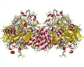 Dihydroorotase (EC 3.5.2.3, carbamoylaspartic dehydrase, dihydroorotate hydrolase) is an enzyme which converts carbamoyl aspartic acid into 4,5-dihydroorotic acid in the biosynthesis of pyrimidines.[1][2] It forms a multifunctional enzyme with carbamoyl phosphate synthetase and aspartate transcarbamoylase. Dihydroorotase is a zinc metalloenzyme.[3]