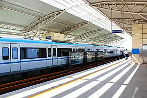 Dijiao (Chinese: 堤角站) is a station of Line 1 of the Wuhan Metro, opened along with the completion of Line 1 (Phase 2) on July 29, 2010.[1] It is an elevated station situated on Jiefang Avenue, with easy access to Dijiao Park and bus transfers to Hankou North. The station has two side platforms. Trains terminating at Dijiao Station uses a single crossover to access the westbound platform. The eastbound platform has entered fared service for Line 1's Hankou North extension on July 28, 2014.[2]