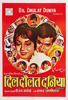 Dil Daulat Duniya (transl.Love, Wealth and the World) is a 1972 Hindi-language comedy-drama film, directed by Prem Narayan Arora and starring Rajesh Khanna, Sadhana, Ashok Kumar, Om Prakash, Sulochana, Helen and Jagdeep. The film revolves around a poor man in a palatial house who allows other newcomers in city of Mumbai to stay in his house as he feels pity on them. The music was scored by Shankar Jaikishan and songs are sung by Kishore Kumar for Rajesh Khanna. This movie was accepted by Khanna, only because he wanted to pay tribute to the acting talents of his seniors Ashok Kumar and Om Prakash, as his name would ensure that distributors would sell the film and it would reach a larger audience. The newspaper "The Hindu", in its review said "Ashok Kumar and Om Prakash are the soul of the movie and dominate the show with their acting dexterity."[1] The film fetched 1.5 crores at the box office. As of 2012, this was among the top 10 searched movies of Khanna online.[2]