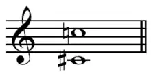 In music from Western culture, a diminished octave (ⓘ) is an interval produced by narrowing a perfect octave by a chromatic semitone.[1] As such, the two notes are denoted by the same letter but have different accidentals. For instance, the interval from C4 to C5 is a perfect octave, twelve semitones wide, and both the intervals from C♯4 to C5 and from C4 to C♭5 are diminished octaves, spanning eleven semitones. Being diminished, it is considered a dissonant interval.[3]