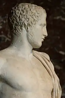 When the sacrifice of Iphigenia (Agamemnon's daughter) became a necessity for the Achaeans to sail away from Aulis, King Agamemnon had to choose between sacrificing his daughter and resigning from his post of high commander among Achaeans. When he decided to sacrifice his daughter to Artemis, Odysseus carried out this order of Agamemnon by luring Iphigenia from Mycenae to Aulis, where murder, disguised as wedding, awaited her.[9] According to Hyginus, Diomedes went with Odysseus to fetch Iphigenia, making this the two companions' first mission together.[10] However, Pseudo-Apollodorus has Agamemnon send Odysseus and Talthybius instead.[11] According to Euripides, neither of the two went to fetch Iphigenia, though he calls the plan Odysseus' idea in Iphigenia at Taurus.[12]