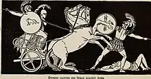 Hector soon marked the havoc Diomedes and Odysseus were making, and approached them. Diomedes immediately threw his spear at Hector, aiming for his head. This throw was dead accurate but the helmet given by Apollo saved Hector's life. Yet, the spear was sent with such great force that Hector swooned away. Meanwhile, Diomedes ran towards Hector to get his spear. Hector recovered and mingled with the crowd, by which means he saved his life from Diomedes for the second time. Frustrated, Diomedes shouted after Hector calling him a dog. The son of Tydeus, frequently referred to as the lord of war cry, was not seen speaking disrespectful words to his enemies before.