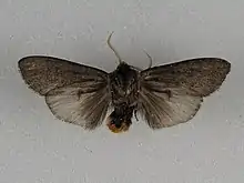 Discophlebia catocalina, the yellow-tailed stub moth is an Australian moth species found in the south-eastern quartile of Australia. It is classified within the Oenosandridae moth family in the Noctuoidea Superfamily, the largest superfamily of the Order Lepidoptera.[1] It is visually recognised by its characteristic pointed yellow tail and is a medium-sized moth species with a wingspan range of 40mm-60mm depending on gender. Discophlebia Catocalina have evolved to feed on various species of eucalypt.