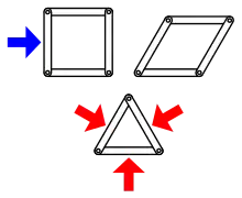 Graphs are drawn as rods connected by rotating hinges. The cycle graph C4 drawn as a square can be tilted over by the blue force into a parallelogram, so it is a flexible graph. K3, drawn as a triangle, cannot be altered by any force that is applied to it, so it is a rigid graph.