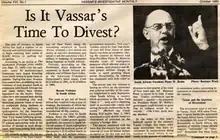 The campaign to divest from South Africa gained prominence on university campuses in the United States in the mid-1980s; the debate headlined the October 1985 issue of Vassar College's student newspaper.[1]
