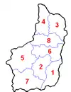 Prior to 2002, Rwanda was composed of prefectures, subprefectures (which were sometimes called "districts")[1] and 154 communes (Kinyarwanda: imijyi, sing. umujyi).[2][3] In 2002, communes were replaced by two kinds of divisions called districts and municipalities (Kinyarwanda: akarere and umujyi).[2] In 2006, the number of districts was reduced from 106 to 30.[2]