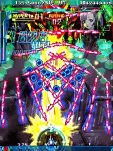 DoDonPachi SaiDaiOuJou (怒首領蜂 最大往生, Dodonpachi Saidaiōjō) lit. "Angry Don Bee Biggest Death" is a vertically scrolling bullet hell arcade game released by Cave in 2012, and the sixth chapter in Cave's DonPachi series. A Japanese-region free release was released on May 30, 2013.[1] An updated version, titled DoDonPachi SaiDaiOuJou EXA Label in Japan and DoDonPachi True Death EXA Label internationally, was released for the exA-Arcadia arcade platform in 2020, featuring a new "EXA Mode" difficulty.[2][3][4][5]