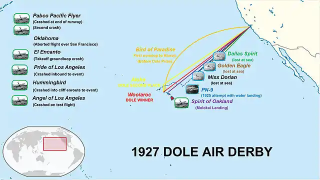 158. 1 2 "Dole Prize Race Aided Aviation Principals State". Santa Cruz Evening News. AP. August 23, 1927. Retrieved 5 March 2020.