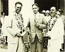 The publicity for the first successful transpacific flights from Oakland to Hawaii was stolen by two flights in June and July 1927, ahead of the scheduled August start for the Dole Derby. On 28 June, about a month after Dole posted the prizes, Air Corps Lieutenants Lester J. Maitland and Albert F. Hegenberger flew a three-engine Atlantic-Fokker C-2 military aircraft from Bay Farm Airport in Oakland to Wheeler Army Airfield on Oahu in 25 hours and 50 minutes.[8][9] An earlier attempt in 1925 had ended in failure for two Navy PN-9 seaplanes; one of the aircraft, commanded by Commander John Rodgers, ran out of fuel several hundred miles short of Hawaii and sailed to Kauai over the next nine days.[10]