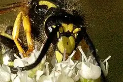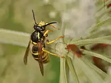 Tree wasps carry out worker policing and have a haplodiploid sex-determination system; this results in a high level of relatedness within the colony.[5][6] The workers will take over all of the foraging from the queen once the first workers reach adulthood. Worker wasps typically forage for other insects, the nectar of plants, and wood to digest for nest construction.[4][7] The tree wasp is sometimes a victim of the nest parasite Dolichovespula omissa, who lays its eggs in the nest of D. sylvestris, as well as individual parasites including roundworms.[8][9]