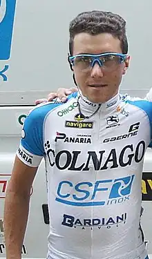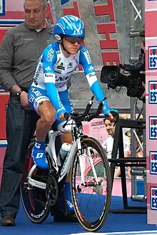 Domenico Pozzovivo (born 30 November 1982) is an Italian professional road racing cyclist, who currently rides for UCI ProTeam Israel–Premier Tech.[10] His very small stature confer him with the qualities of a pure climbing specialist. He is most known for a victory in stage 8 of the 2012 Giro d'Italia, an overall victory in the 2012 Giro del Trentino, and is notable for his educational attainments.[11]