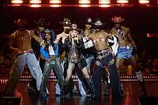 "Don't Tell Me" was included on the Celebration Tour (2023—2024), where it was given a cowboy theme.[100] Madonna donned a leather corset, a cowboy hat created by Ruslan Baginskiy, and custom-made knee-high Miu Miu steel-toe boots.[101] During the number –which included line dancing– she was joined by one of her twin daughters, and guest star Bob the Drag Queen dressed as a rodeo clown.[102][103] The performance ended with the singer engaging in a mock shootout with Bob. "Don't Tell Me" was named one of the best moments of the concert by Billboard's Joe Lynch.[103]