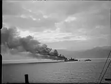 Sinclair's ship, HMS Karanja, on fire in the harbour at Bougie, Algeria, prior to sinking, November 1942