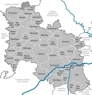 Donau-Ries (Danube-Ries) is a Landkreis (district) in Swabia, Bavaria, Germany. It is bounded by (from the north and clockwise) the districts of Ansbach, Weißenburg-Gunzenhausen, Eichstätt, Neuburg-Schrobenhausen, Aichach-Friedberg, Augsburg and Dillingen, and by the state of Baden-Württemberg (districts of Heidenheim and Ostalbkreis).