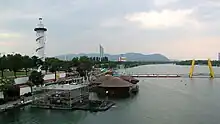 Copa Cagrana with lighthouse and pontoon bridge, from SE. In the background: Millennium Tower, Kahlenberg (w. antenna), Leopoldsberg (w. church) and, far out, Klosterneuburg.