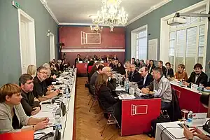 Prior to the conference, the international personalities are sitting at the table at the back, the organizers at the table at the center, and the Basque politicians, syndicalists and other social agents at the tables at the sides.