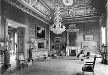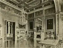 - "The green and red drawing-rooms follow in succession from the saloon. The ceilings of both were painted by Signor Anglinatti while the frieze of the latter is a bright bit of work by Sir Coutts Lindsay... The furniture of these drawing-rooms is well worth notice. Every piece is good of its kind and is thoroughly adapted to the style of its surroundings and its individual place."[11]