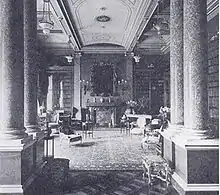 - "The library emerged as a magnificent and functional reflection of the superb quality of the books....The walls were covered in green silk damask and the floor with a buff and green Axminster carpet. The glass-enclosed bookcases were of carved and gilded walnut made by Holland and Sons, each center compartment being 13.6 feet high and 8 feet wide."[9]